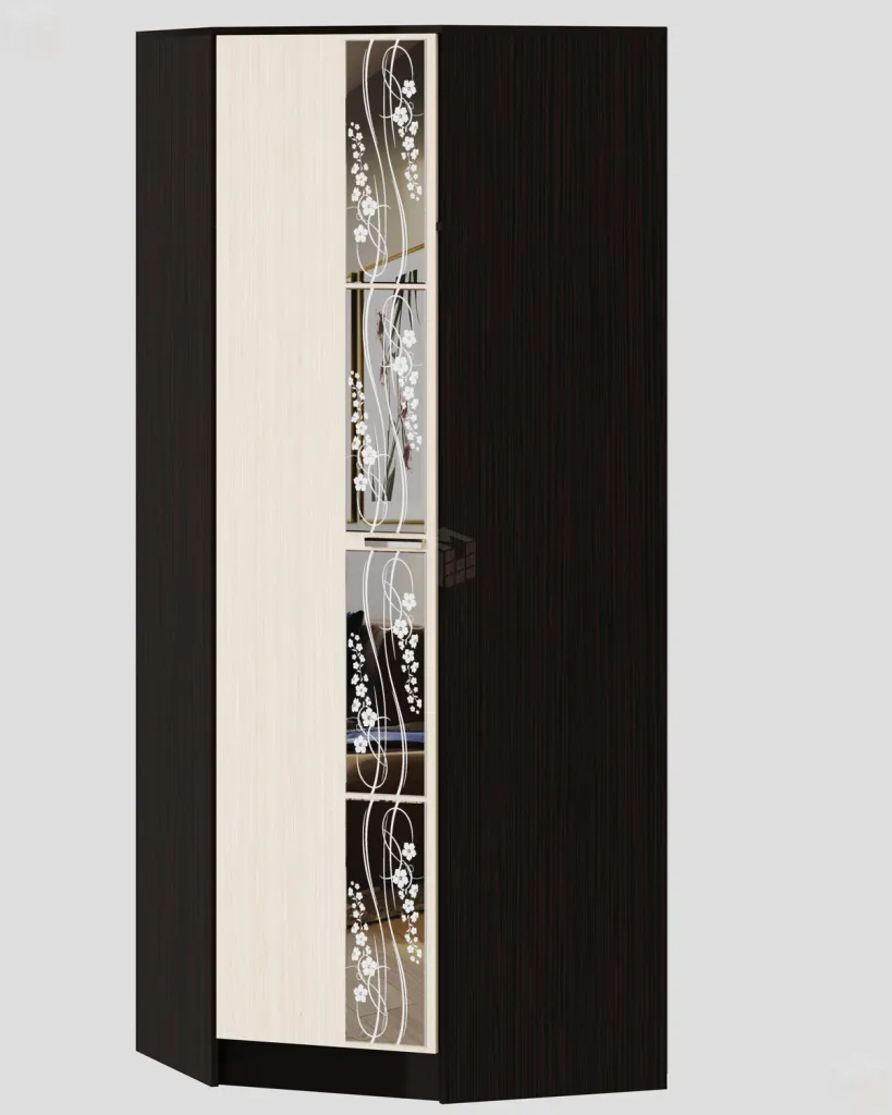 Шкаф угловой СУ-870 "Сабина" с полками и поперечной металлической штангой. Фасад облицован зеркалами с пескоструйным орнаментом, повторяющимся во всех элементах системы.