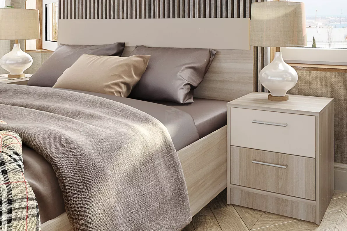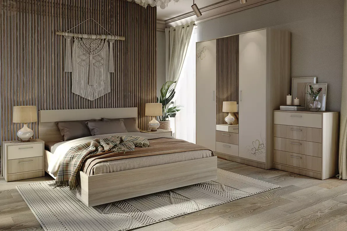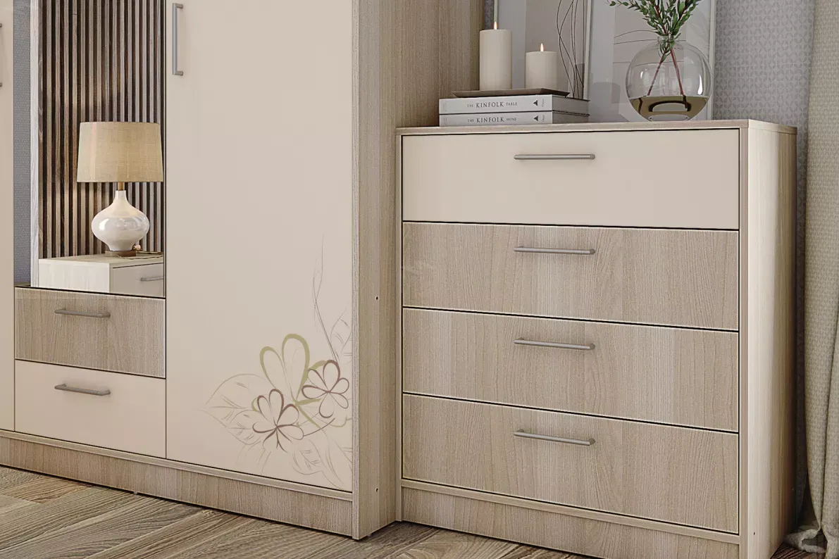 Корпус спальни изготовлен из 16 мм ламинированной древесностружечной плиты. Торцевые поверхности корпуса закромлены кромками ПВХ и ABS. Фасады изготовлены из 16 мм ламинированной древесностружечной плиты. По периметру фасады закромлены кромками ПВХ и ABS.
