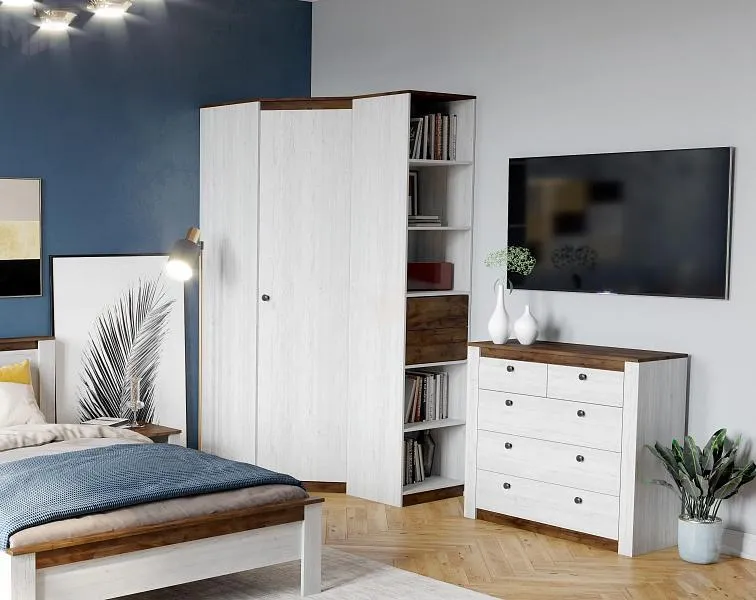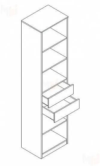 Четыре открытые полки и два выдвижных ящика на шариковых направляющих. -