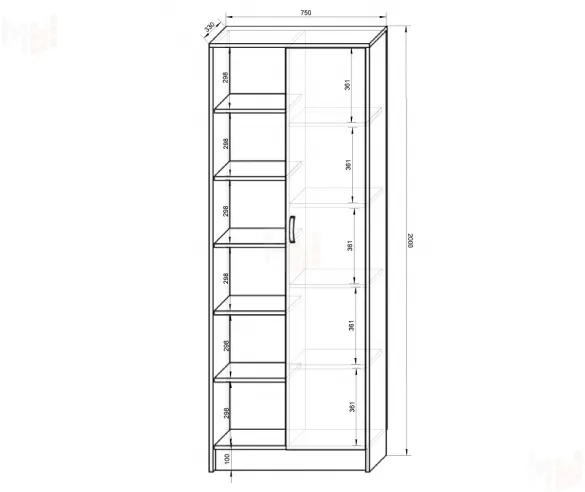 Размеры: высота 2000 мм, ширина 750 мм, глубина 330 мм