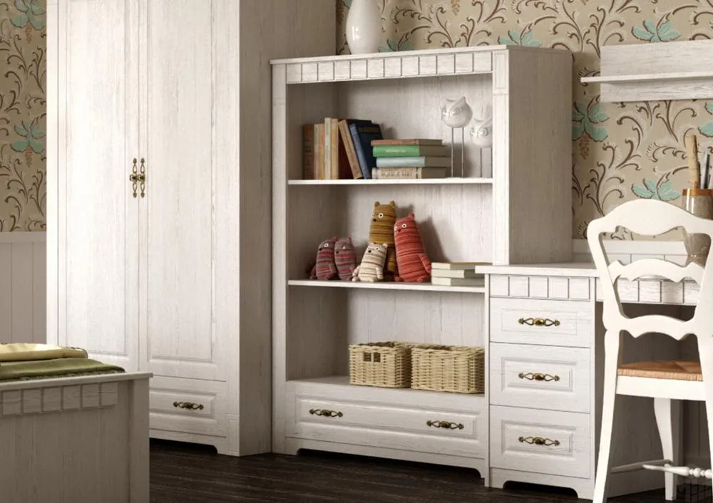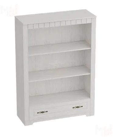 Стеллаж состоит из двух полок для хранения игрушек или иных предметов и выдвижного ящика на шариковых направляющих глубиной 350 мм, установленного в нижней части изделия.