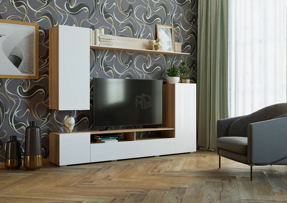Компактная "МИЯ" - это гостиная, выполненная в современном европейском стиле. Неоспоримым преимуществом данной модели является минималистичный внешний вид, совмещённый с необходимой эргономичностью гостиной. Широкая цветовая гамма декоров корпуса и фасадов позволяет выбрать Покупателю самый подходящий вариант. Гостиная «МИЯ» примет Ваших самых дорогих и близких людей теплом и уютом, а компактные размеры подходят к комнатам с любой планировкой и площадью. Горизонтальные текстуры фасадов визуально расширяют пространство и создают приветливую атмосферу. Мебель изготавливается из ЛДСП зарекомендовавших себя заводов «Kronospan».