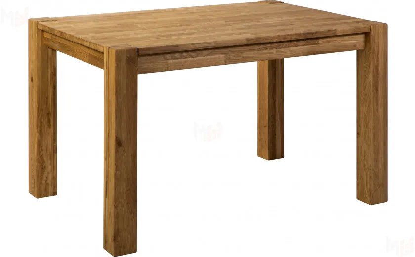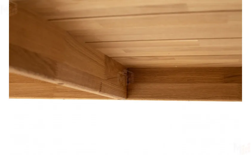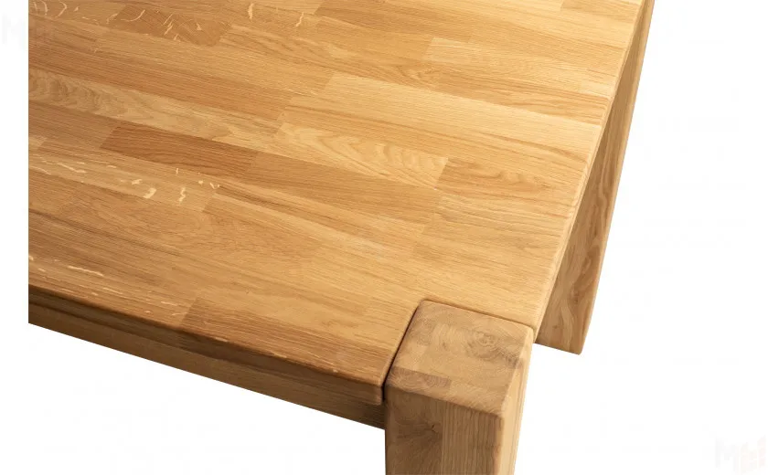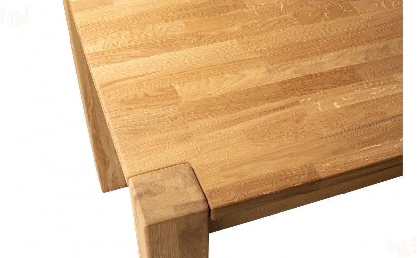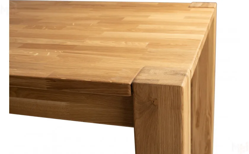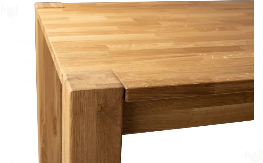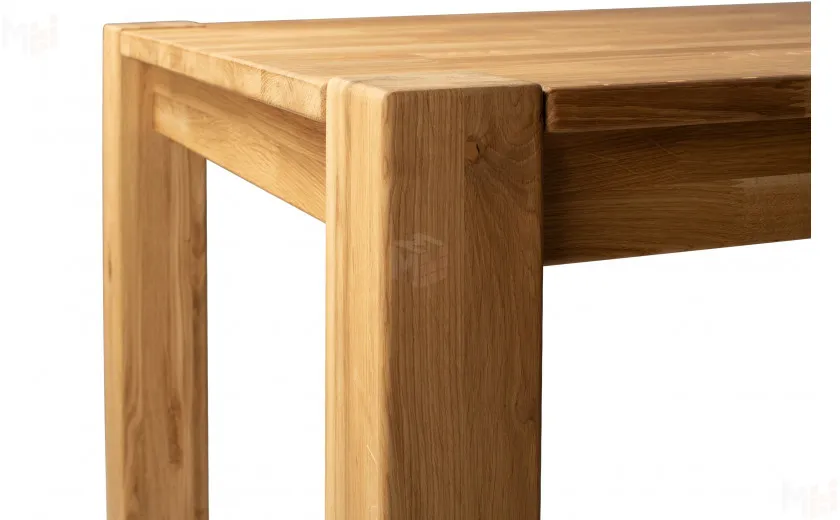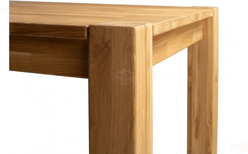 Стол полностью выполнен из массива дуба, без использования каких-либо искусственных материалов, например таких как МДФ или ЛДСП. Стол имеет прямоугольную форму размером 120 см в длину и 80 см в ширину. Столешница толщиной 25 мм, выполнена из массива дуба с высоким царговым поясом, что придает ему солидный и брутальный внешний вид. Стол покрывается маслом OSMO, которое отлично подчеркивает уникальный рисунок натурального материала. Ножки так же выполнены из массива дуба и имею размер в сечении 190*190 мм. За столом комфортно можно разместить четыре персоны.
