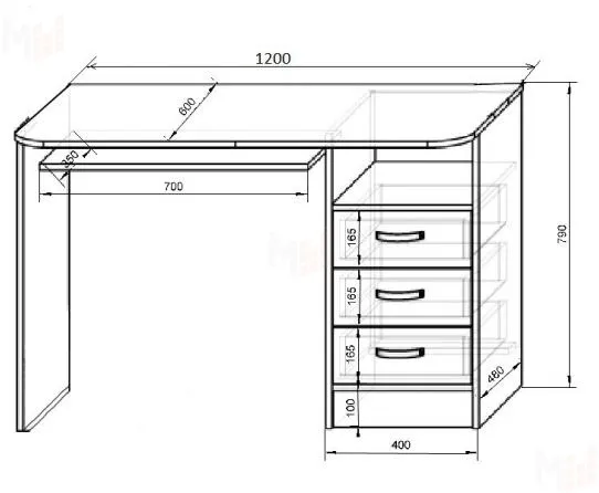 Имеет полноценную рабочую поверхность с выкатным элементом под клавиатуру.