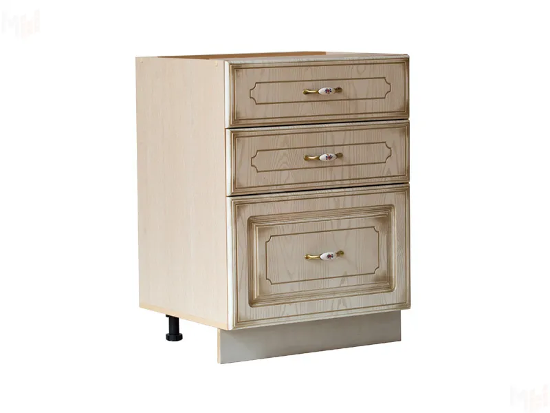 Стол рабочий с тремя выдвижными ящиками. Два верхних - неглубокие. Фасады на таких ящиках без глубокой вырезки, с декоративно отделкой патиной.