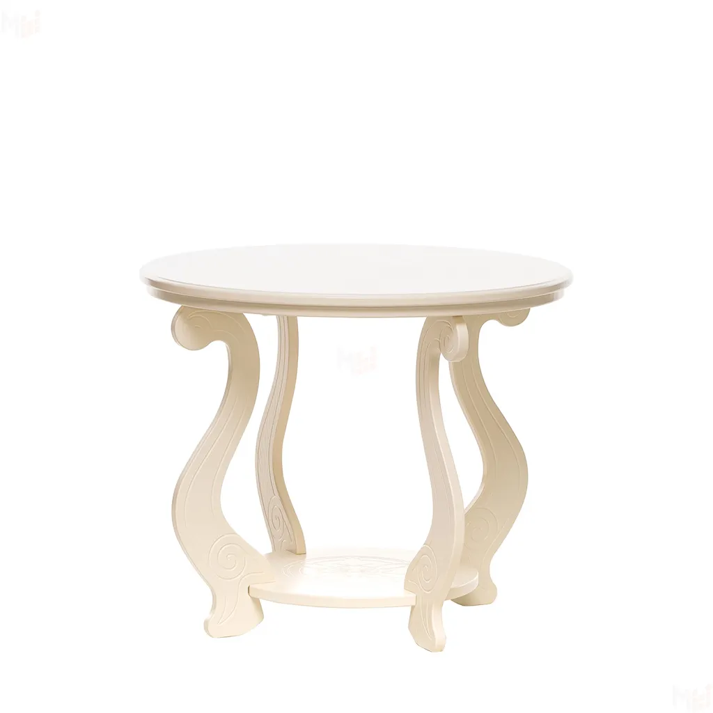 Круглый изящный столик с удобной полочкой. Форма ножек стола придает ему воздушность. Высококачественный МДФ и отделочный шпон различных цветов делают столик надежным и очень долговечным.