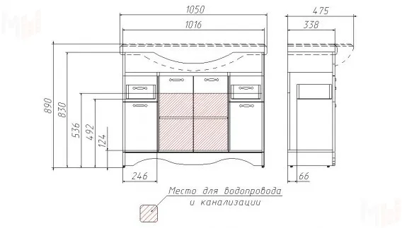 ширина 1016 мм, глубина 338 мм, высота 820 мм