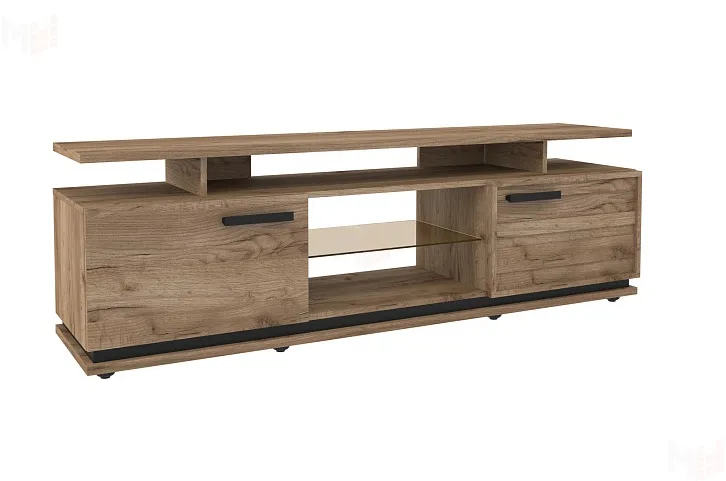 Стильная и аккуратная тумба приятного древесного оттенка гармонично впишется в интерьер гостиной в стиле Лофт. Визуально легкая конструкция не загромождает пространство и делает его более функциональным. Комбинированный вариант открытых полок со шкафчиками с глухими фасадами отлично подойдет для размещения многочисленной видеоаппаратуры, дисков и журналов. Благодаря вытянутой форме тумбы на ней без труда поместится телевизор с диагональю до 75'', а две удобные распашные дверцы позволят убрать от посторонних глаз личные вещи.