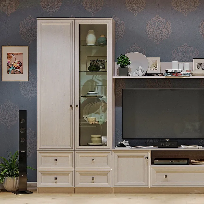 Длинная, но не глубокая тумба под ТВ с диагональю до 60'' займет центральное место в вашей гостиной. Удачное сочетание функционала и эстетики делают ее поистине универсальной. Модуль оснащен различными типами ящиков в которых можно разместить часто используемые вещи, книги и аудио- и видеоаппаратуру. Выдвижной ящик оснащен шариковыми направляющими полного выдвижения и способен выдержать нагрузку до 20 кг. А оптимальная высота конструкции позволит расположить телевизор на комфортной для глаз высоте.