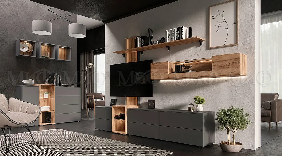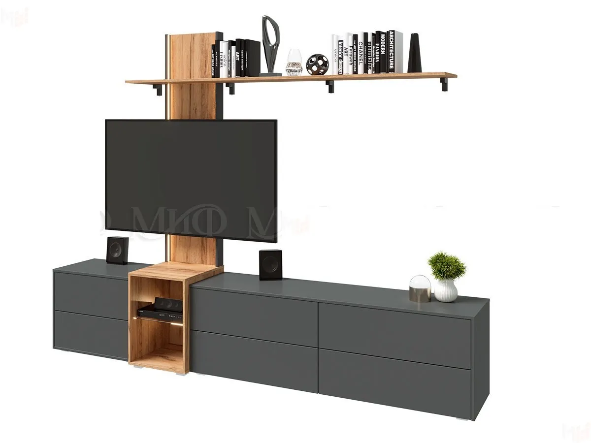 Тумба ТВ Сплит выполнена из ЛДСП Дуб крафт, фасады ЛДСП графит.