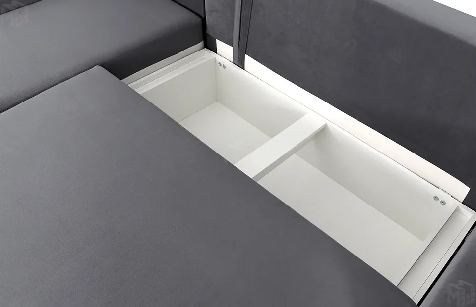 Декоративный кант отличного от основной обивки цвета по контуру изделия и декоративные съемные подушки являются частью отделки дивана. В бельевом ящике удобно хранить спальные принадлежности или любые другие вещи.